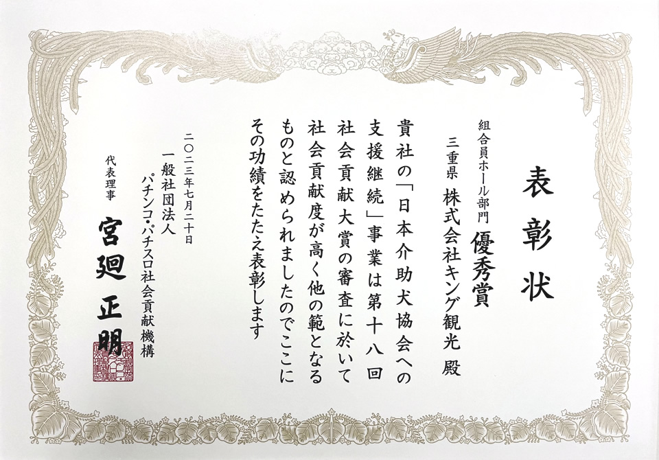 日本介助犬協会様への支援事業の社会貢献に対し「優秀賞」を頂きました。