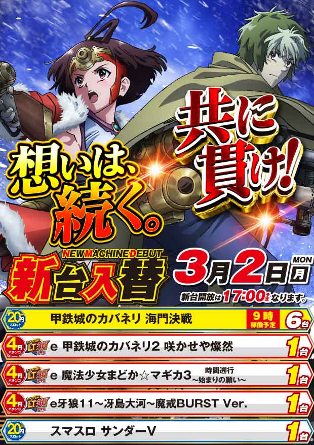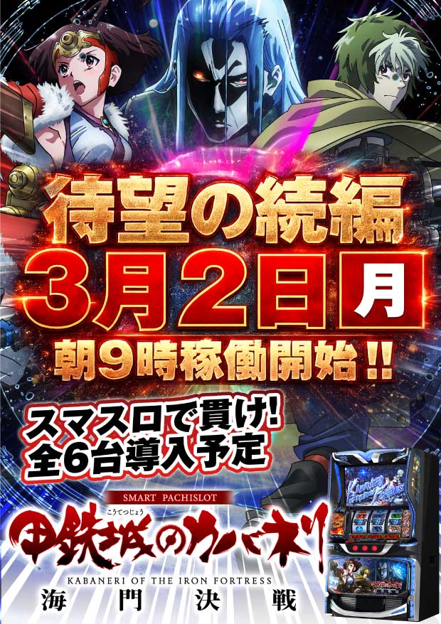 3月2日(月)新台入替!朝9時開店!最新スロットカバネリが朝から打てる!!