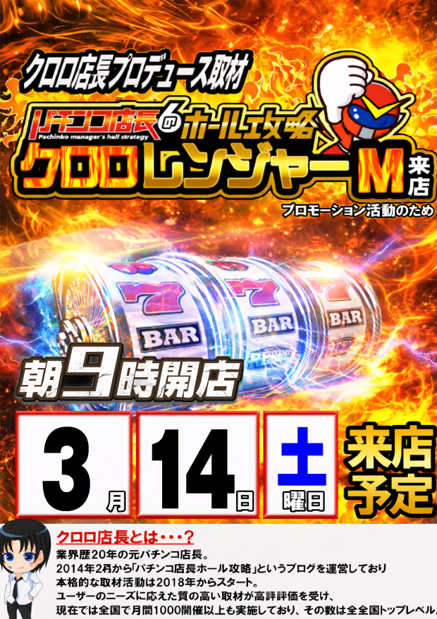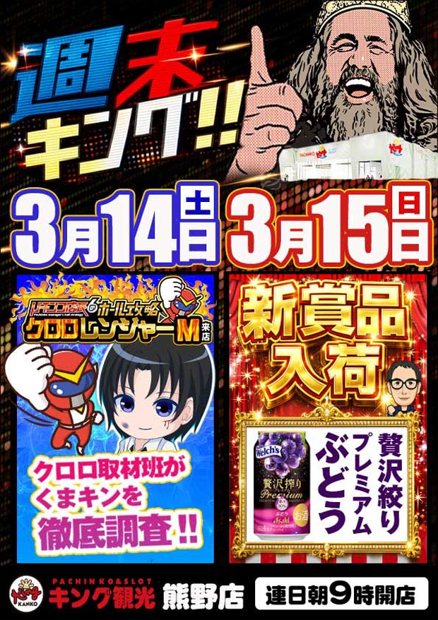 3月14日(土) 朝9時開店!週末キング‼クロロレンジャーM来店&新賞品入荷♪